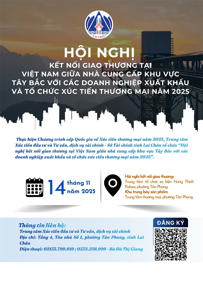 Thực hiện Chương trình cấp Quốc gia về Xúc tiến thương mại năm 2025, Trung tâm Xúc tiến đầu tư và Tư vấn, dịch vụ tài chính - Sở Tài chính tỉnh Lai Châu tổ chức “Hội nghị kết nối giao thương tại Việt Nam giữa nhà cung cấp khu vực Tây Bắc với các doanh nghiệp xuất khẩu và tổ chức xúc tiến thương mại năm 2025”.