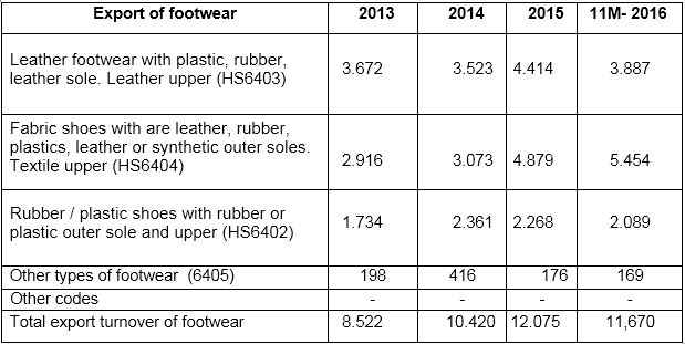 The production index of leather and footwear industry in 2016 is only 3.7% higher than in 2015, much lower than the levels of 17.4% in 2015 and 22% in 2014. Low growth of leather and footwear production occurs partially due to global economic fluctuations in 2016, demand in the world market is declining, especially in the EU. In the domestic market, the difficult economic situation, natural calamities, floods, etc. also reduce the demand. Estimated footwear production in 2016 reached 1100-1150 millions of pairs, of which export accounts for about 90% and domestic consumption - 10%. FDI enterprises account for 80% of the industrial production value of the sector.
