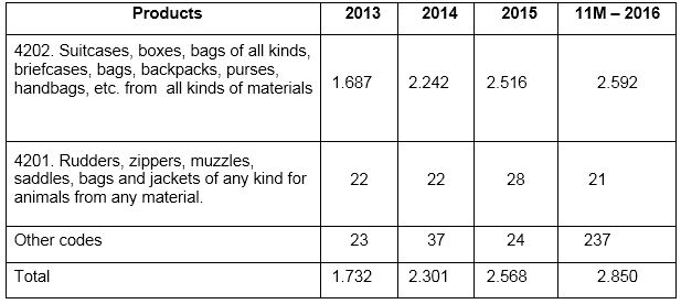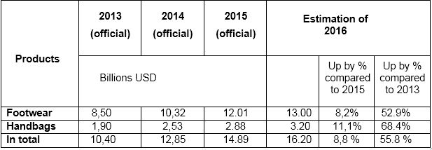 According to the preliminary data by the General Department of Customs, it is estimated that in 2016 the total export of footwear, leather and handbag industry will reach 16.2 billion USD, up 8.8% compared to 2015, lower than the rise of 23.6% (2014 vs 2013) and an rise of 16% (2015 vs 2014). Exports of leather and footwear sector account for over 9% of total export turnover of whole country in 2016. Of which, footwear exports were estimated at 13 billion USD, up 8.2% and handbags and leather products were estimated at 3.2 billion USD, up 11.1% compared to 2015 (illustrated in table 1). Exports of shoes ranked 4th and exports of suitcases, handbags and bags ranked 10th in the list of top 10 export items of Vietnam.