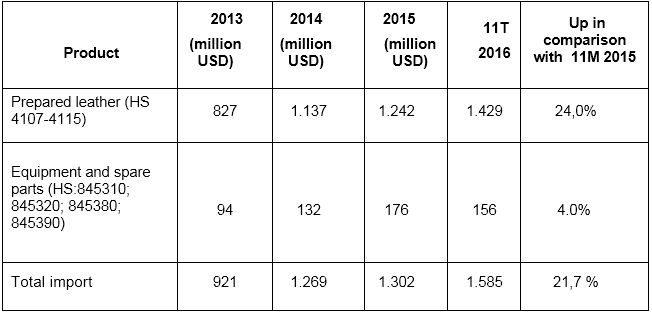 In the first 11 months of 2016, Vietnam imported prepared leather of value over 1429 million USD, up 24% compared to the same period of 2015, mainly from China (260 million USD), South Korea (174 million USD), Italy (165 million USD), Thailand (146 million USD), Taiwan (149.3 million USD), etc. In the 11 months of 2016, imports of equipment and spare parts reached 156 million USD, up 4% compared to the same period in 2015, mainly from Taiwan, China and South Korea.