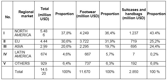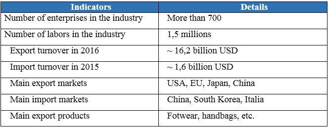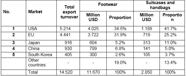 Vietnam is the third largest footwear manufacturing country in Asia after China, India, and places fourth in the world. Currently, Vietnam is producing about 920 million pairs of shoes annually and exporting more than 800 million pairs to more than 50 markets around the world, of which European Union (EU) accounts for the largest proportion. Handbag products are also exported to 40 countries, of which the US market accounts for the highest rate of 41.6%.