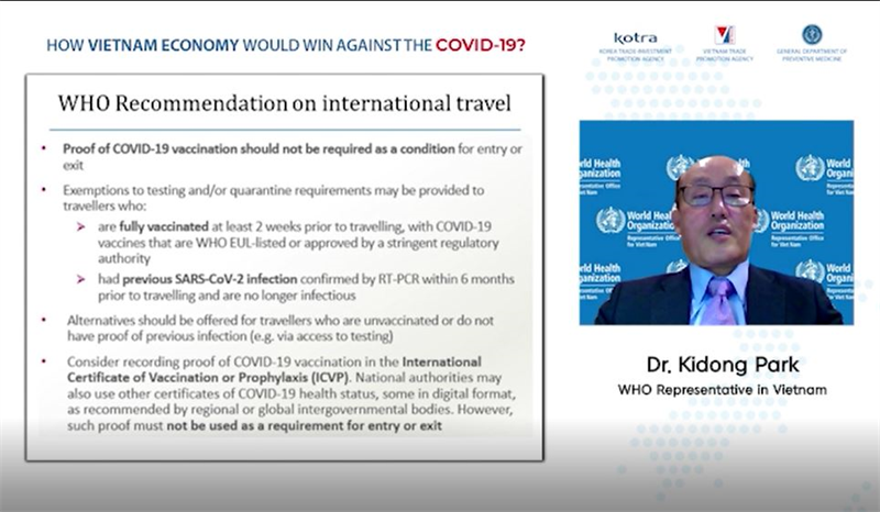 특히 이번 웨비나에는 박기동 박사 - 세계보건기구(WHO) 베트남 사무소장이 참석해 전 세계와 베트남의 코로나19 확산 상황에 대해 이야기를 해주셨습니다. 박기동 박사는 베트남의 방역 활동을 높이 평가하고 올바른 길을 가고 있으며 한국 기업이 베트남 중앙 정부, 보건부 및 지방성의 규정을 완전히 준수하여 안전한 생산 시스템을 유지할 수 있도록 권장하고 해결법을 제공하였습니다.
