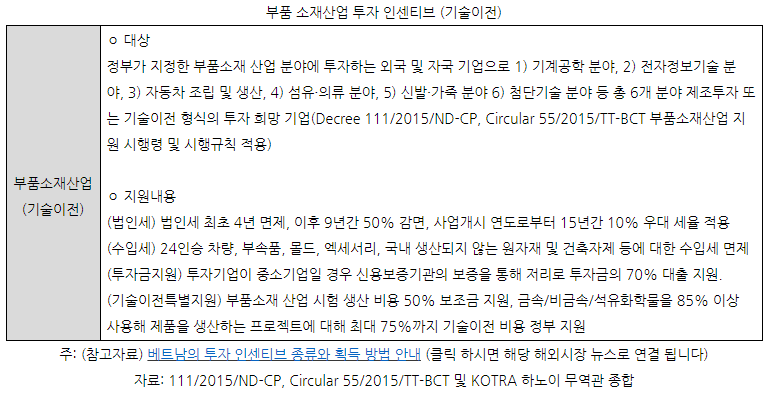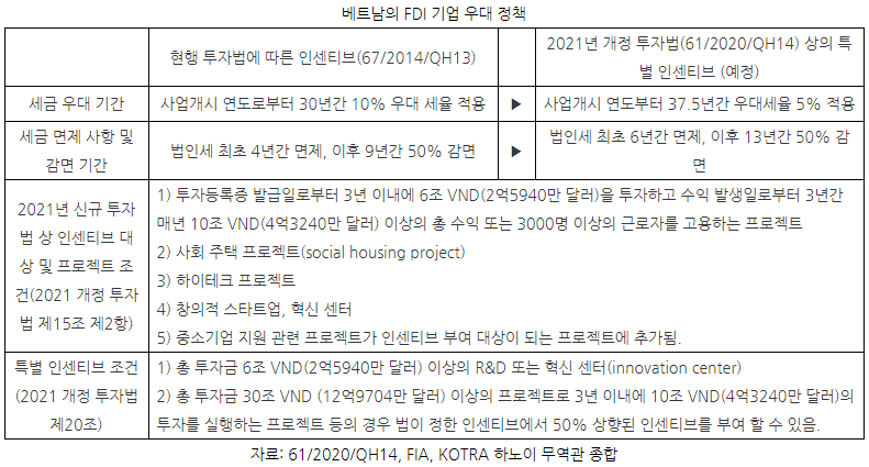 *자료: 61/2020/QH14, 111/2015/ND-CP, 115/NQ-CP, 베트남 투자청(FIA), VIRAC, 베트남 산업청(VIA), 베트남 기획투자부, 베트남 관세청(GDVC), 베트남 통계청, 및 KOTRA 하노이 무역관 자료 종합
