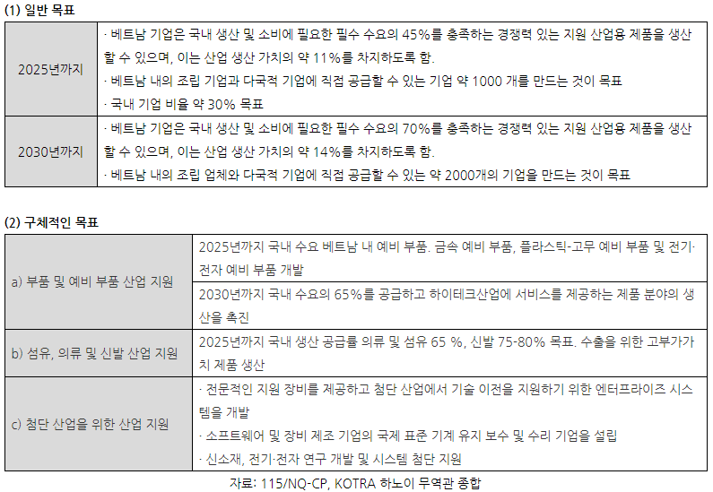 응우옌 쑤언 푹총리는2020년 8월 6일 산업부가 제안한 부품산업 촉진을 위한 결의안 115에 서명하고 10년 안에 다국적 기업에 부품을 직접 공급할 수 있는 2000개의 기업을 만드는 것을 목표로 관련 산업의 발전을 촉진하기로 했다. 이 내용에 대해 베트남 산업청의 Le Huyen Nga 산업지원부장은 다음과 같이 안내했다.