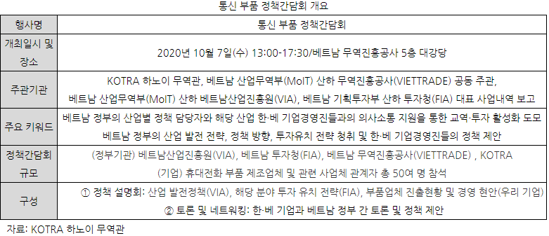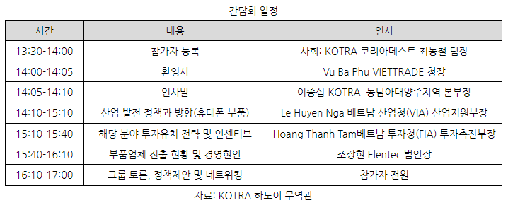KOTRA 하노이 무역관, 베트남 산업부 산하 무역진흥공사(VIETTRADE), 베트남 기업인 연합회(VIA), 베트남 기획투자부 산하 투자청(FIA)이 공동 주최한 이 간담회에는 양국 각 부처 대표 및 한국 통신부품 관련 베트남 진출 기업대표 등 총 50여 명이 참석했다.