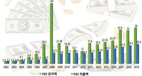 지난 18개년간 베트남 FDI 유치액과 지출액 추이
