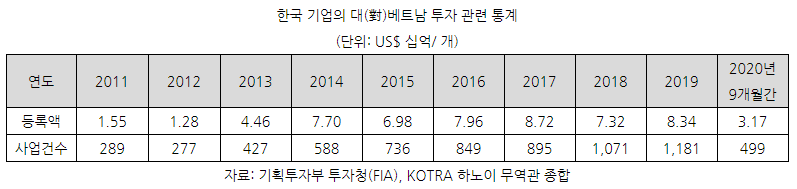 한국은 지난 30년간 138개의 FDI 투자국 중 총 투자규모와 사업건수를 종합했을 때 투자국 1위를 차지했다. 2020년 9월까지 기획투자부에 등록된 한국 기업의 대(對)베트남 총 투자액 및 사업 건수는각각 701억 달러, 8913건이었다.