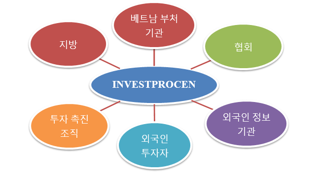 INVESTPROCEN 효과 및 프로페션무역 및 산업 개발 투자 촉진 센터 (Investment Promotion Center for Industry and Trade - “INVESTPROCEN”) 는 베트남 무역 및 산업부 – 무역 촉진국에 산하 기관이다. INVESTPROCEN은 산업 및 무역 개발 투자 촉진 임무를 실행하는 역할로 무역& 산업부에서 2013년 05월 14일자에 설립된다. 기능, 임무+ 무역 및 산업 개발 투자 촉진 정책 및 전략 을 구성함에 참모 + 투자 촉진 행사, 프로그램 등 개최 + 산업 & 무역 개발 투자 촉진 활동을 실현함에 지원 + 베트남에 투자하는 기업, 투자자, 사업 들에게 자문 + 투자 연결 + 산업 – 무역 개발 투자 촉진 활동, 현황에 대한 연구 + 투자 촉진 분야에 인사 능력 교육 및 향상 + 투자유지를 위한 홍보, PR 개발 전략INVESTPROCEN이 국제 투자자와 베트남에 지방, 공업단지, 기업 들 사이에 최고 연결다리가 되도록 나날이 파트너, 전문가, 협력자 등의 조직 네트워크를 확장하고 있다. 당기관의 장점 - 국가, 영토 50개국에서 정부 조직, 지방, 기업 들과의 투자 연결 네트워크 - 정확하고 적시의 정보 공급 - 이상적인 투자연결 홍보 시스템 - 고수준 및 전문성이 보유한 직원 들- 베트남에 투자 혼경에 대한 이해- 외국인 기업 들의 투자 수요에 대한 이해 멀티 연결 네트워크 조직 구조 자율성 및 고수준이 보유한 직원과 투자촉진 분야에 경험이 많은 전문가 들의 바탕으로 INVESTPROCEN은 투자촉진 분야에 고품질서비스 들로써 점차로 신뢰성을 높이고 실질적인 이익을 고객에게 제공해 주면서 베트남 산업과 무역 개발에 기여하고 있다.