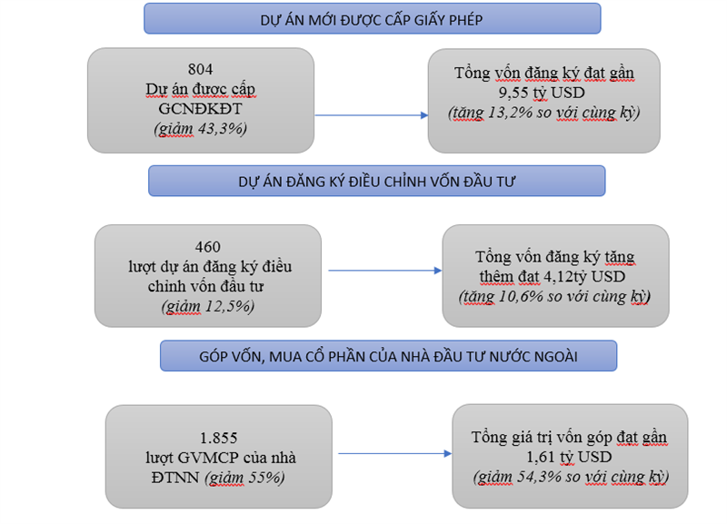 Theo số liệu thống kê, tính đến 20/6/2021, tổng vốn đăng ký cấp mới, điều chỉnh và góp vốn mua cổ phần, mua phần vốn góp (GVMCP) của nhà ĐTNN đạt 15,27 tỷ USD, bằng 97,4% so với cùng kỳ năm 2020. Vốn thực hiện của dự án đầu tư trực tiếp nước ngoài ước đạt 9,24 tỷ USD, tăng 6,8% so với cùng kỳ năm 2020.