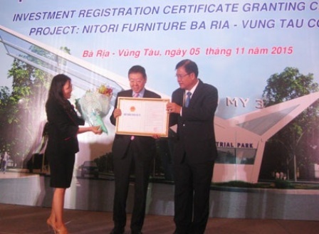 Ngày 5/11 vừa qua, UBND tỉnh Bà Rịa - Vũng Tàu đã tổ chức lễ trao Giấy chứng nhận đăng ký đầu tư cho Công ty TNHH Nitori Bà Rịa - Vũng Tàu thuộc Tập đoàn Nitori Holdings Nhật Bản. Tham dự buổi lễ có ông Nguyễn Văn Trình - Chủ tịch UBND tỉnh Bà Rịa - Vũng Tàu và ông Nakajima Satoshi - Tổng Lãnh sự Nhật Bản tại Thành phố Hồ Chí Minh.