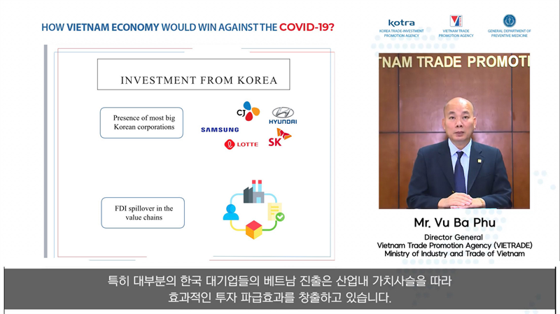 Ngày 04 tháng 8 năm 2021, Cục Xúc tiến thương mại (Bộ Công Thương) phối hợp với Cơ quan Xúc tiến Thương mại - Đầu tư Hàn Quốc (KOTRA), Tổ chức Y tế Thế giới tại Việt Nam, Cục Y tế Dự phòng (Bộ Y tế), Sở Kế hoạch Đầu tư tỉnh Vĩnh Phúc và Trung tâm Xúc tiến Thương mại và Đầu tư TP. Hồ Chí Minh tổ chức “Hội thảo trực tuyến “Nền kinh tế Việt Nam sẽ chiến thắng đại dịch Covid-19 như thế nào?” trong khuôn khổ hoạt động của Ban Korea Desk. Hội thảo thu hút gần 200 đại diện doanh nghiệp Hàn Quốc tham dự trực tuyến.