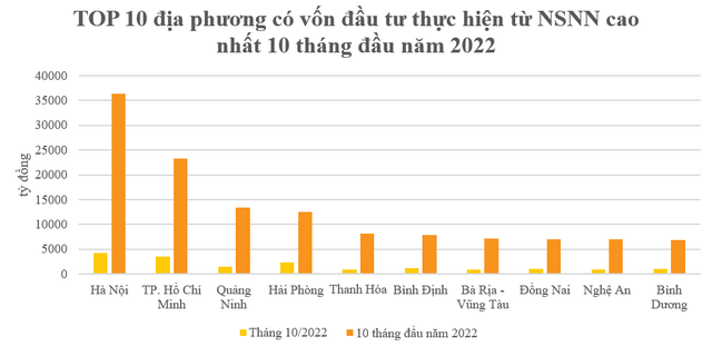 Là địa phương có tỷ lệ hoàn thành kế hoạch cao nhất cả nước, Quảng Ninh là địa phương có vốn đầu tư thực hiện từ NSNN cao thứ 3 trên cả nước với hơn 13,4 nghìn tỷ đồng, đạt 81% so với kế hoạch. Tiếp theo là Hải Phòng và Thanh Hóa với vốn NSNN lần lượt đạt 12.498 tỷ đồng và 8.152 tỷ đồng. Các tỉnh khác cũng nằm trong top 10 địa phương có vốn đầu tư thực hiện từ nguồn NSNN cao trong 10 tháng đầu năm 2022 là Bình Định, Bà Rịa - Vũng Tàu, Đồng Nai, Nghệ An và Bình Dương.