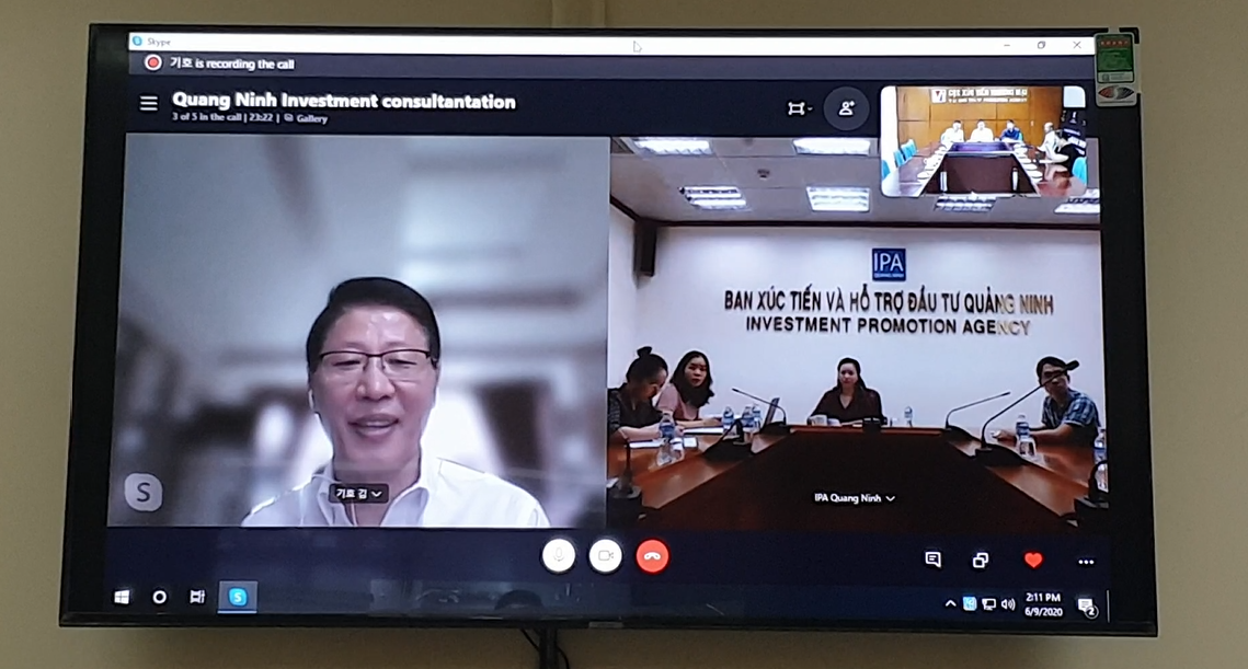 Buổi Họp trực tuyến “Tư vấn Xúc tiến Đầu tư Hàn Quốc với tỉnh Quảng Ninh” có sự tham dự của ông Hoàng Minh Chiến -Phó Cục Trưởng Cục Xúc tiến Thương Mại, bà Vũ Kim Chi – Phó Trưởng ban Xúc tiến Đầu tư tỉnh Quảng Ninh và ông Kim Kee Ho – Chuyên gia tư vấn cao cấp Hàn Quốc.