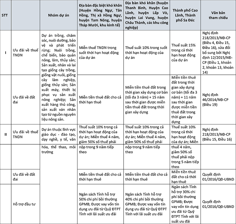 Một số ưu đãi về đầu tư đối với các dự án trên đại bàn tỉnh Đồng Tháp