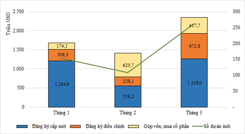 Trong đó, có 522 dự án mới được cấp Giấy chứng nhận đăng ký đầu tư (GCNĐKĐT) (tăng 62,1% so với cùng kỳ), tổng vốn đăng ký đạt hơn 3 tỷ USD (giảm 5,9% so với cùng kỳ); Có 234 lượt dự án đăng ký điều chỉnh vốn đầu tư (tăng 2,6% so với cùng kỳ), tổng vốn đăng ký tăng thêm đạt gần 1,21 tỷ USD (giảm 70,3% so với cùng kỳ); Có 703 lượt GVMCP của nhà ĐTNN (giảm 4,2% so với cùng kỳ), tổng giá trị vốn góp đạt gần 1,22 tỷ USD (giảm 25,5% so với cùng kỳ).