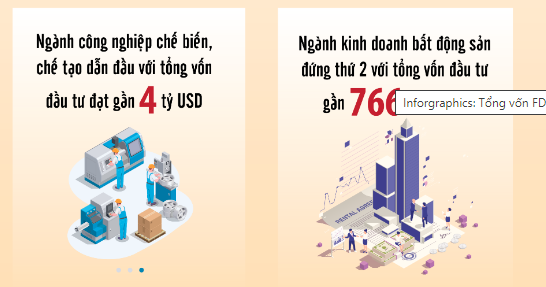 Về đầu tư vào các ngành hàng, các nhà đầu tư nước ngoài đã đầu tư vào 17 ngành trong tổng số 21 ngành kinh tế quốc dân; trong đó, ngành công nghiệp chế biến, chế tạo dẫn đầu với tổng vốn đầu tư đạt gần 4 tỷ USD, chiếm 73% tổng vốn đầu tư đăng ký và giảm 25% so với cùng kỳ, theo sau là ngành hoạt động kinh doanh bất động sản với tổng vốn đầu tư gần 766 triệu USD, chiếm gần 14,1% tổng vốn đầu tư đăng ký và giảm 71,6% so với cùng kỳ; các ngành bán buôn, bán lẻ với tổng vốn đầu tư gần 276 triệu USD, vận tải kho bãi với tổng vốn đăng ký đạt gần 151 triệu USD.