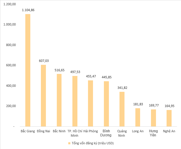 Về đầu tư vào các địa phương, các nhà đầu tư nước ngoài đã đầu tư vào 44 tỉnh, thành phố trên cả nước trong 03 tháng đầu năm 2023. Theo đó, Bắc Giang dẫn đầu với tổng vốn đầu tư đăng ký hơn 1,1 tỷ USD, chiếm gần 20,3% tổng vốn đầu tư đăng ký và tăng gấp 5,2 lần so với cùng kỳ năm 2022, trở thành địa phương đầu tiên ghi nhận tổng vốn FDI đăng ký vượt mốc 1 tỷ USD trong năm 2023. Vốn đầu tư của Bắc Giang tăng mạnh do có tới 3 dự án đầu tư lớn, có vốn đầu tư trên 100 triệu USD. Các dự án này đã chiếm tới 97% tổng vốn đầu tư của Bắc Giang trong 3 tháng. Theo sau Bắc Giang, Đồng Nai xếp thứ hai với 18 dự án mới, tổng vốn đầu tư đăng ký hơn 607 triệu USD, chiếm hơn 11,1% tổng vốn đầu tư cả nước, tăng gấp 3 lần so với cùng kỳ. Cụ thể, trong 3 tháng đầu năm 2023, Đồng Nai có 18 dự án cấp mới, tổng vốn đăng ký cấp mới đạt 64,36 triệu USD; 22 dự án điều chỉnh vốn, với lượng vốn điều chỉnh đạt hơn 323,43 triệu USD; 8 lượt dự án góp vốn mua cổ phần với giá trị vốn góp khoảng 607 triệu USD.
