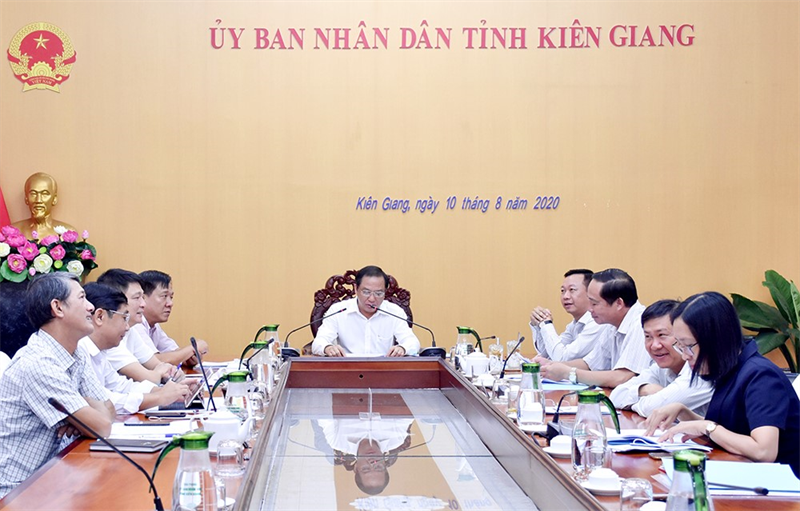 Ông Nguyễn Đức Chín, phó chủ tịch UBND tỉnh (bàn chủ toạ) chủ trì cuộc họp tại điểm cầu tỉnh Kiên Giang về hội nghị hợp tác Hành lang kinh tế Campuchia - Việt Nam - Thái Lan, ngày 10-8.